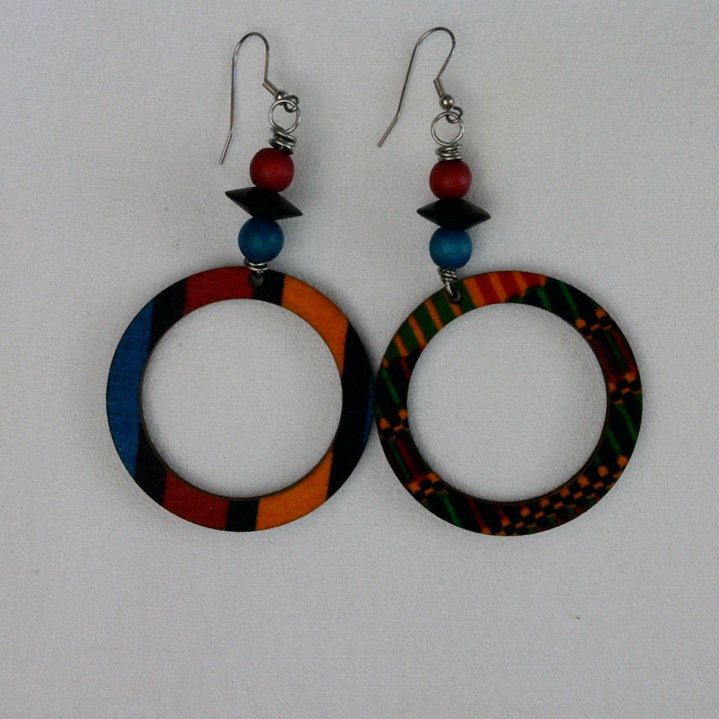 These handcrafted open-circle earrings are made from lightweight wood and wrapped in bold, multicolor Ankara fabric, creating a playful yet grounded statement piece. The circular silhouette symbolizes wholeness and connection, while the mix of patterns adds visual interest and cultural depth.